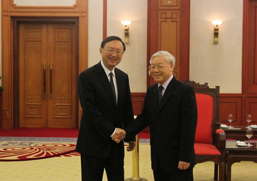 杨洁篪向阮富仲、陈大光分别转达了中共中央总书记、国家主席习近平的亲切问候。杨洁篪表示,去年中越两党总书记实现历史性互访,就巩固睦邻友好、深化互利合作达成重要共识,为中越关系发展进一步指明了方向。双方应认真落实领导人共识,保持高层密切交往,加强对两党两国关系的顶层设计;深入开展党际、防务、外交、执法及地方交流与合作;加快对接发展战略,共同推进“一带一路”和“两廊一圈”建设,不断提升两国务实合作规模和水平;增进人文交流,加强民生合作,巩固中越传统友谊的社会基础;共同推进海上合作,有效管控分歧,维护海上稳定。