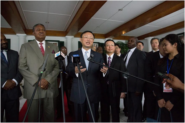 From February 8 to 10, 2015, Chinese State Councilor Yang Jiechi paid a visit to Zimbabwe, during which he held talks with President Robert Mugabe and Vice President PhelekezelaMphoko respectively, attended the welcome dinner hosted by VP Mphoko, as well as meeting with the Chinese and Zimbabwean journalists at the State House after his meeting with President Mugabe. Chinese Ambassador Mr. Lin Lin, Vice Foreign Minister Mr. Zhang Ming, Vice Minister of Commerce Mr. Fang Aiqing and Mr. Kong Quan, Vice Minister of the Office of the Foreign Affairs Directorate of the CPC Central Committee accompanied Yang Jiechi throughout the visit.