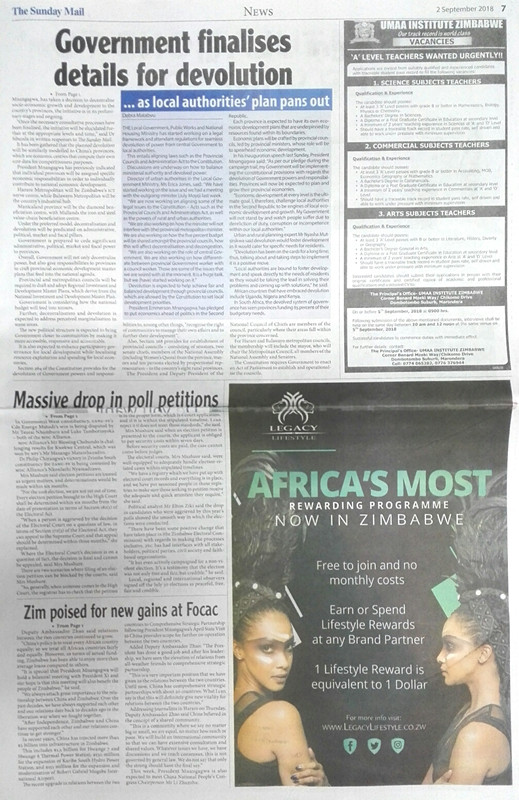 9月2日,在2018年中非合作论坛北京峰会即将开幕及津巴布韦总统姆南加古瓦率团赴华参会之际,经驻津使馆推动与策划,津第一大报《先驱报》周日版《星期日邮报》(the Sunday Mail)出版增刊并在其他版面发表重要评论文章,受到各方广泛关注,为峰会召开及姆南加古瓦总统参会营造了良好舆论氛围。