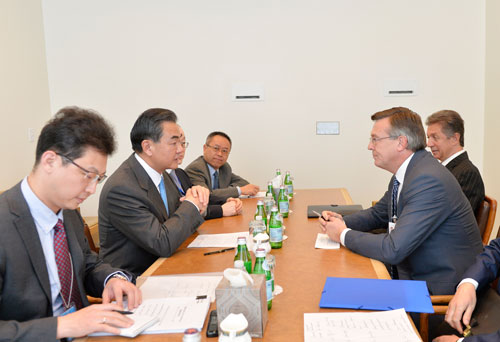 2013年9月25日,外交部长王毅在纽约联合国总部会见乌克兰外长科扎拉。