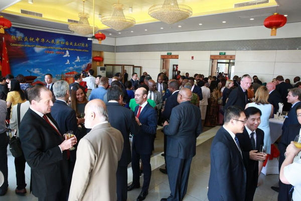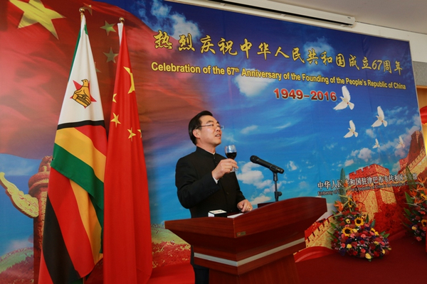 黄大使在致辞中回顾了建国67年,尤其是改革开放以来中国国家建设取得的重大成就。黄大使介绍了近年中非关系发展取得的重要成果,强调中国推动本月初举行的G20杭州峰会决定,采取集体行动支持非洲和最不发达国家工业化,这是中非友谊的又一有力体现,同时也将中国与包括津巴布韦在内的非洲国家关系提升到一个新的高度。