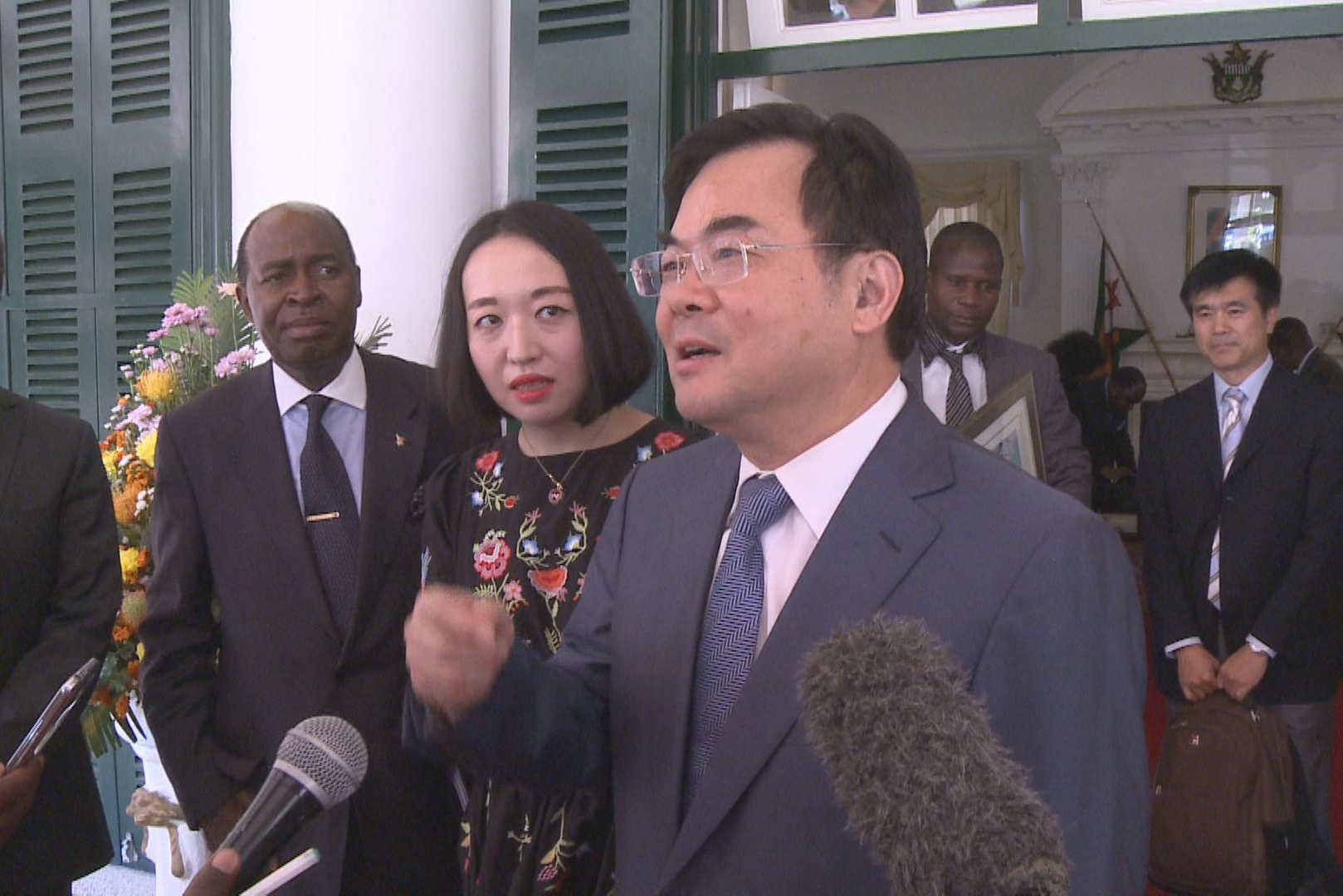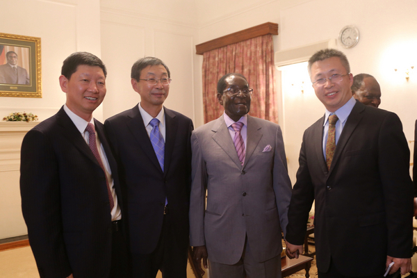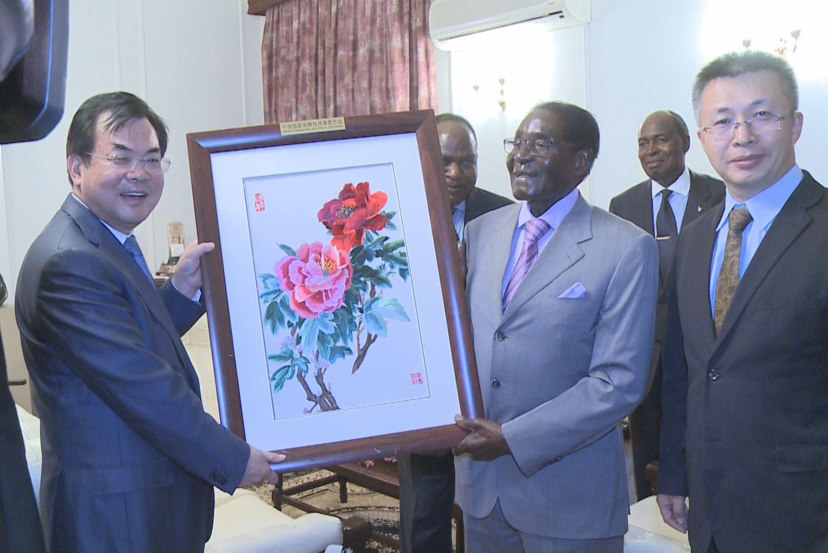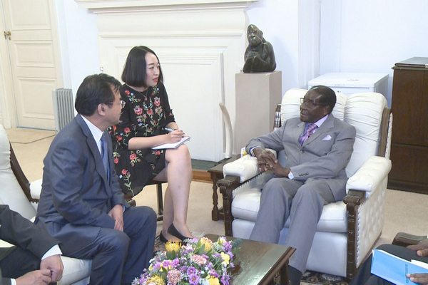 10月31日,津巴布韦总统穆加贝在总统府会见率团访津的国家发展改革委副秘书长范恒山。中国驻津使馆临时代办赵宝钢、国家发展改革委国际合作中心主任曹文炼及津总统内阁办公室首席秘书西班达等会见时在座。