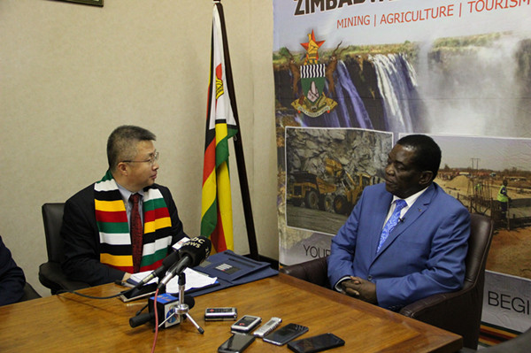 3月31日,津巴布韦总统姆南加古瓦应邀接受新华社、中国国际广播电台、中国中央电视台驻津记者联合专访,就中津关系、即将对中国进行国事访问等问题回答记者提问。中国驻津巴布韦使馆临时代办赵宝钢出席并主持专访。