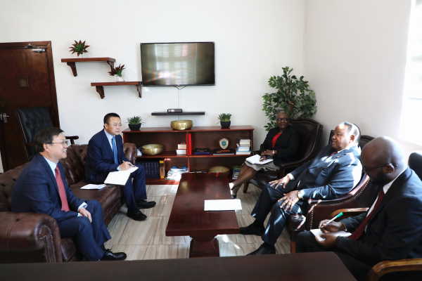 6月19日,周鼎大使拜会津外交和国际贸易部长沙瓦,就深化两国关系、推进双边务实合作深入交换意见。