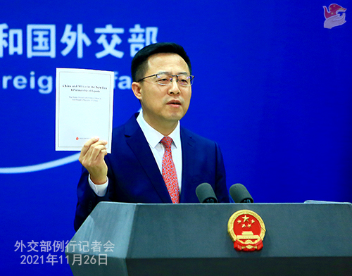 赵立坚:今天上午,国务院新闻办公室发布《新时代的中非合作》白皮书。这是中国政府发布的首部全面介绍中非合作的白皮书,也是党的十八大以来首部介绍中国同某一地区合作成果的白皮书。