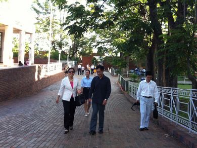 交流会后,大使夫人廖元翠代表读书会向孔子学院和津大学生赠送了礼物,大家在孔子像前合影留念,依依惜别并相约再聚。最后,刘秀岩教授带领读书会参观了孔子学院教学楼和津大校园,充满中国气息的孔子学院、宁静秀美的津大校园和热情求知的津大同学给大家留下了深刻的印象。