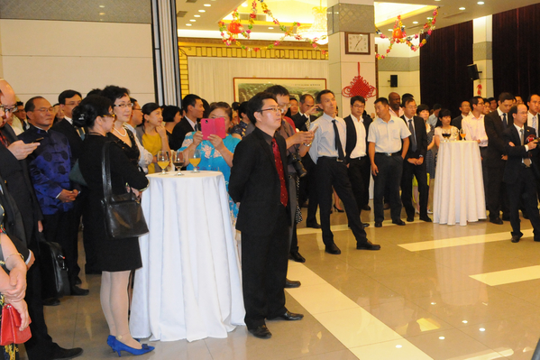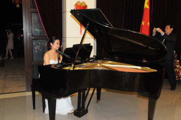招待会始终洋溢着欢乐祥和的气氛。华侨艺术团及使馆外交官也表演了精彩的歌舞、笛子独奏、钢琴独奏等节目,将招待会推向了高潮。