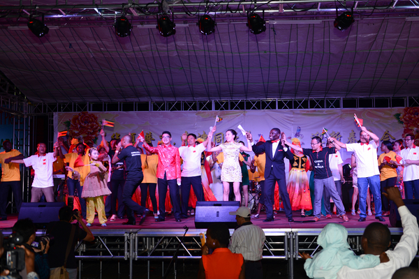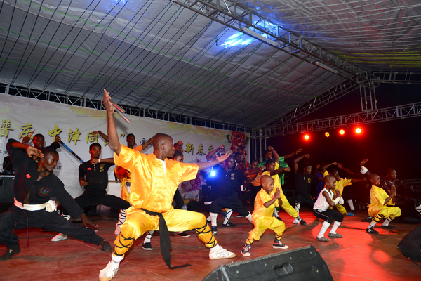 庙会的压轴戏是中非合璧的精彩文艺演出。利用业余时间自编自演的中国演员们与当地知名歌星、艺术团、武术协会、孔子学院合唱团等同台表演,联袂献艺。中国歌舞、乐器、服装、武术、太极等具有代表性的中国文化在舞台上被演绎地淋漓尽致,台下观众则看得如痴如醉,不时报以热烈的掌声和欢呼声。演出最后当地黑人歌手与中国演员们合唱原创歌曲《中非一家亲》,台下观众载歌载舞,在主唱的带领下齐声喊出“中国和非洲,我们是一家人”。此时璀璨的烟花腾空而起,照亮了哈拉雷的夜空,首届津巴布韦华侨华人迎新春庙会完美落幕。