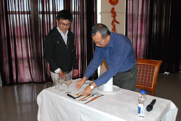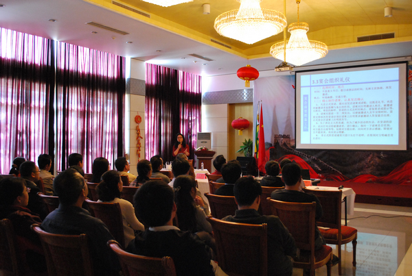 张爱萍结合多年人力资源管理和涉外工作经验,精心制作了图文并茂的宴请礼仪PPT,通过大量实例详细介绍了宴会形式、组织、服务礼仪及吃西餐常识等内容,无论是五花八门的各式宴会、别有讲究的就餐礼仪,还是各种餐具的使用、不同食物的吃法,通过学习张爱萍编写的“礼仪口诀”,大家很快记住了各类常识与技巧。现场还举行了礼仪知识测试并开展分组讨论,大家为了一副刀叉的摆放、一个座次的安排等问题各抒己见,面对大小不一、形状各异的刀叉匙盘杯等器具现场尝试摆台。在近两个小时的讲座里,大家系统地学习了餐饮宴会礼仪和西餐常识,均感到受益匪浅,也更加认识到学好用对宴请礼仪知识在对外工作中的重要性。