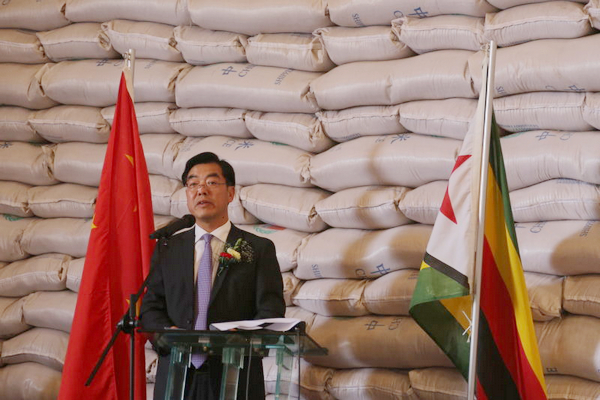 黄屏大使在致辞中表示,中国政府向津巴布韦提供紧急粮食援助是落实去年习近平主席访问津巴布韦和出席中非合作论坛约堡峰会成果的重要举措,中国有句古话“民以食为天”,中国政府始终将农业和粮食问题作为头等大事。近年来,受厄尔尼诺现象影响,津粮食短缺情况严重,作为津巴布韦“全天候”的朋友,中国多次向津提供人道主义粮食援助,与国际社会一道为帮助津人民渡过难关贡献自己的一份力量。同时,中国企业还在烟草、粮食种植等进行了大量投资,为提高津农业收入、增加农业就业人口作出了重要贡献。黄屏表示,“授人以鱼不如授人以渔”。除了粮食援助之外,今年内中方还将向津方无偿提供1万吨化肥,以支持津方尽快实现年产200万吨玉米、完成粮食自给的目标。黄屏大使表示,作为曾经的南部非洲“面包篮子”,中津农业领域合作前景广阔,相信在中津两国政府、企业和人民的共同努力下,津巴布韦农业产业将再现辉煌。