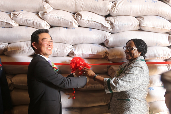 黄屏大使和津方部长签署了交接证书,共同为捐赠的大米剪彩,视察了在现场堆积如山的粮食,并向部分孤儿院、老人院、医院和监狱等代表发放了捐赠的粮食。