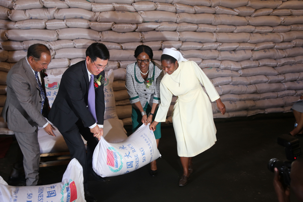 2016年9月15日,中国援助津巴布韦大米交接仪式在津首都哈拉雷举行。中国驻津巴布大使黄屏、津公职人员、劳工和社会福利部长穆波米拉、卫生与儿童福利部长帕瑞仁雅塔瓦、职业教育国务部长宏圭出席仪式。津农业部常秘、社会福利部常秘、津监狱管理局副总监、外交部亚太司司长等高级官员以及哈拉雷省警察代表、粮食管理委员会代表、哈拉雷部分社区和社团代表、津巴布韦大学孔子学院学生等近百人参加了活动。