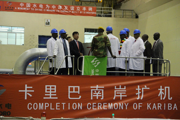姆南加古瓦总统和黄屏大使等听取了项目情况介绍,考察了卡里巴水电站大坝,共同为新落成的7、8号发电机组揭牌并亲手按下发电机组开关按钮,标志着两台新机组正式投产发电。