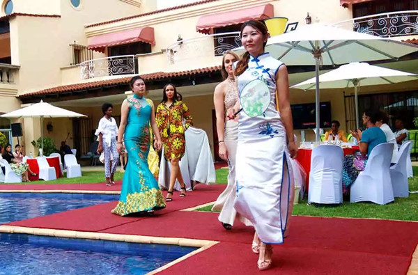 由津巴布韦顶尖模特队和华商会模特队联袂奉献的时装秀最后登场。两国模特身着雍容华美的中式旗袍或由津巴布韦当地知名设计师设计的具有浓郁本土特色的礼服在官邸游泳池边铺设的简易红毯上缓步前行,优雅的台步和迷人的笑容立刻征服了现场观众,大家纷纷举起相机和手机,拍摄下精彩瞬间。掌声、欢笑声、喝彩声此起彼伏,将现场气氛推向高潮。
