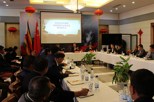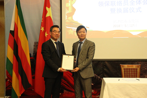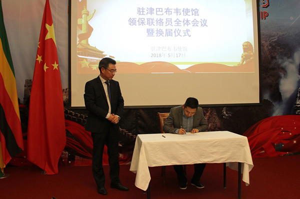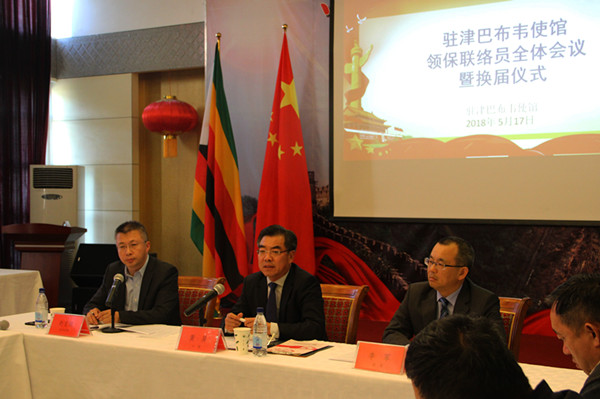 2018年5月17日下午,中国驻津巴布韦使馆举行领事保护联络员全体会议暨换届仪式。驻津巴布韦大使黄屏出席并讲话,使馆政务参赞赵宝钢主持会议,李军武官,津中资企业商会、华商会、华联会负责人,各地区领保联络员以及驻津使馆工作人员、中央媒体驻津记者共40多人与会。