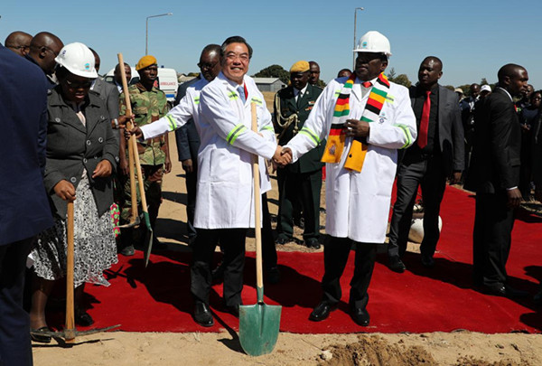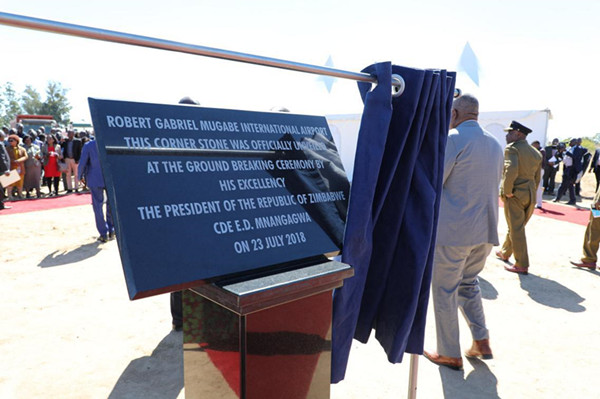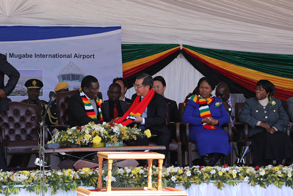 7月23日,由中国进出口银行融资、中国江苏国际集团承建的津巴布韦最大机场罗伯特·加布里埃尔·穆加贝国际机场改扩建项目开工仪式在津首都哈拉雷举行,津总统姆南加古瓦出席开工仪式,民盟全国主席兼环保部长穆春古丽、总统与内阁办公室秘书长斯班达、津交通部长巩博、哈拉雷省省长奇库夸等政府官员陪同。中国驻津巴布韦大使黄屏、中国江苏国际集团海外事业部部长兼海外工程公司总经理张新斌等应邀出席。