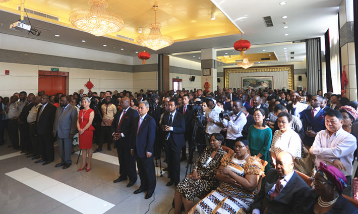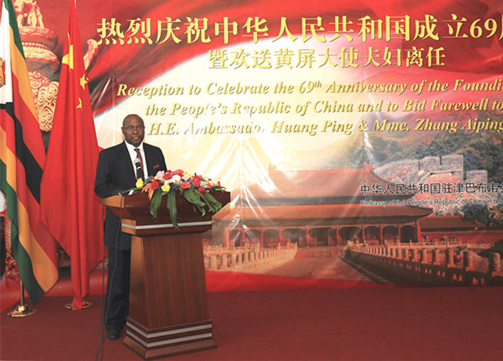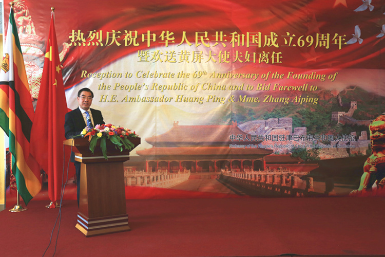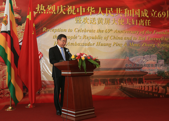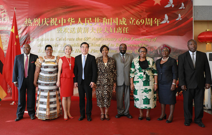 2018年9月20日,中国驻津巴布韦大使黄屏和夫人在使馆举行招待会,热烈庆祝中华人民共和国成立69周年。主宾津代外长、内政部长马瑟马,津议会参议长齐纳莫娜,民盟全国主席、国防和老兵事务部长穆春古丽,民盟外事书记、前外长蒙本盖圭,狱警总监兹曼迪等津党政军高层及社会各界代表,各国驻津外交使节,中资企业和华侨华人代表,中津媒体记者等约800余人出席。