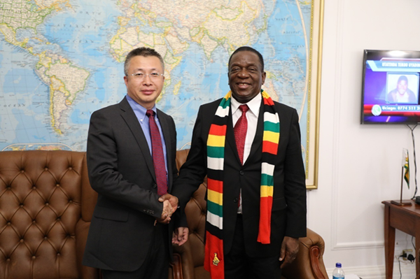 11月2日,中国驻津巴布韦使馆临时代办赵宝钢在津总统府拜会总统姆南加古瓦,双方就落实中非合作论坛北京峰会成果、深化中津合作等问题深入交换了意见。津外交部常秘曼周等会见时在座。