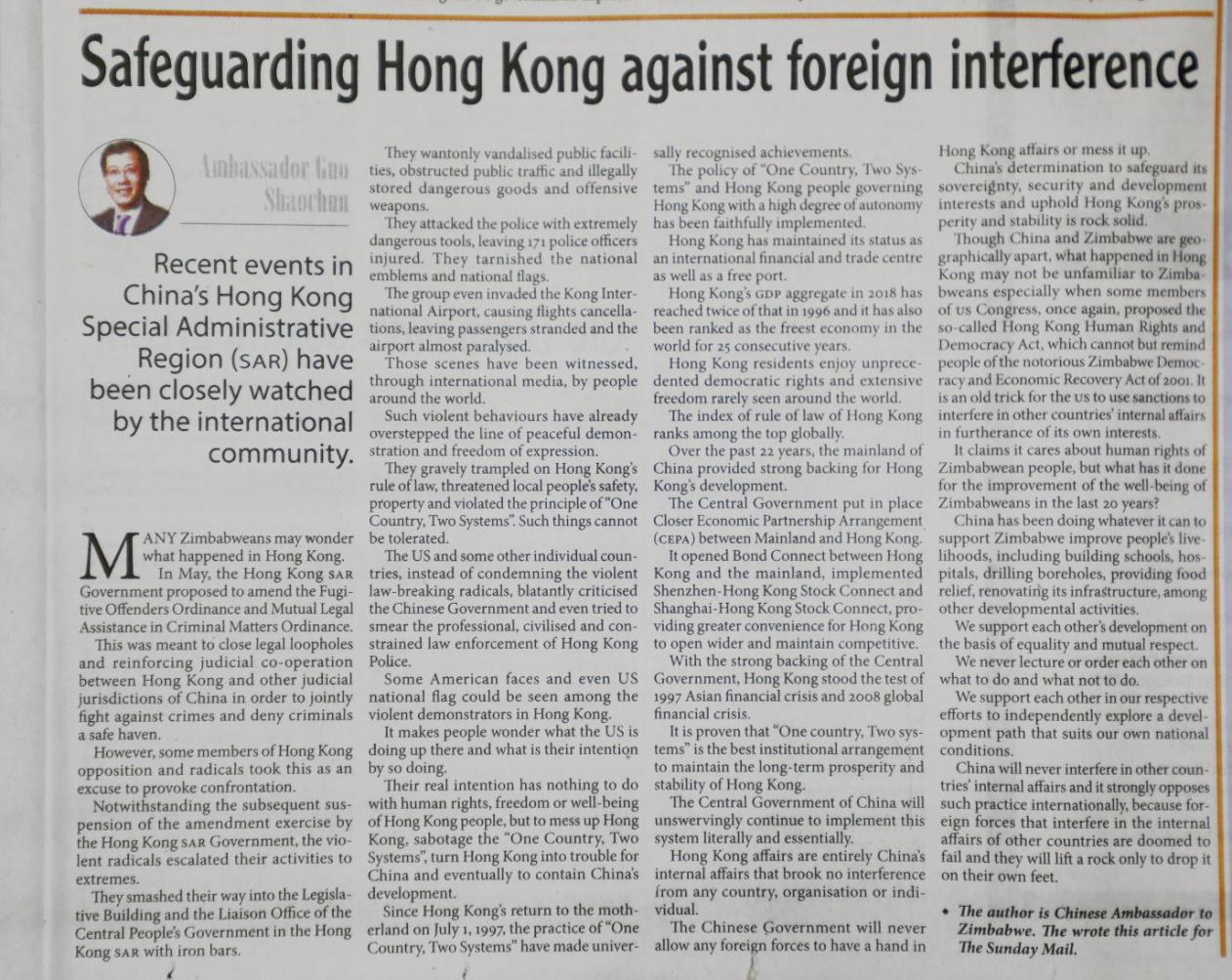 8月18日,中国驻津巴布韦大使郭少春在津巴布韦报业集团旗下最大周报《星期日邮报》评论版发表署名文章,题目是“坚决捍卫香港,反对外部干涉”。