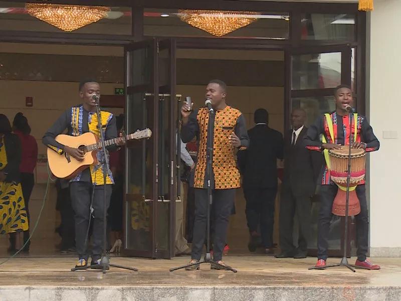 招待会在孔子学院中文合唱团演唱的中津两国国歌声中拉开帷幕。郭少春大使在致辞中用数字和事实介绍了新中国70年来光辉历程和发展成就,强调中国过去70年辉煌成就,归功于中国共产党的坚强领导,归功于中国特色社会主义道路,归功于党和政府全心全意为人民服务的执政理念,归功于中国与世界各国携手共建持久和平与共同繁荣的对外战略。党的十八大以来,在以习近平同志为核心的党中央的坚强领导下,中国特色社会主义道路进入了新时代。今天,我们比以往任何时候都更加接近实现中华民族伟大复兴的中国梦的目标。未来中国的发展将像赞比西河一样奔腾向前,任何个人、任何势力、任何国家都无法阻挡。习近平主席提出共建“一带一路”、推动构建新型国际关系、推动构建人类命运共同体等伟大倡议,为世界各国一道寻求合作共赢、实现共同发展提供了广阔舞台和无限机遇,中国必将为世界和平与发展做出更大贡献。