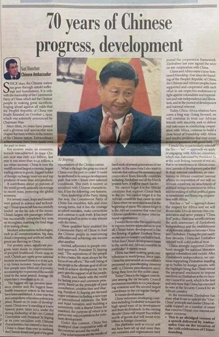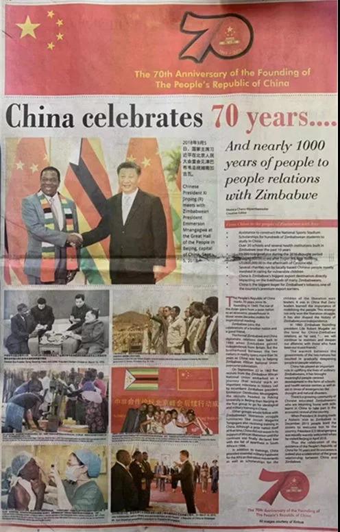 2019年9月25日,驻津巴布韦大使郭少春和夫人王薇参赞在使馆隆重举行庆祝中华人民共和国成立70周年国庆招待会。津执政党民盟全国主席、国防部部长、代外长穆欣古里,新闻部长莫妮卡,能源和电力发展部长查西,民盟外事书记、前外长蒙本盖圭,总统特别顾问穆茨万格瓦,国防军司令西班达,驻津使团团长姆万纳南加等津党政军高层及社会各界代表,各国驻津外交使节,中资企业和华侨华人代表,中津媒体记者等约800余人出席。
