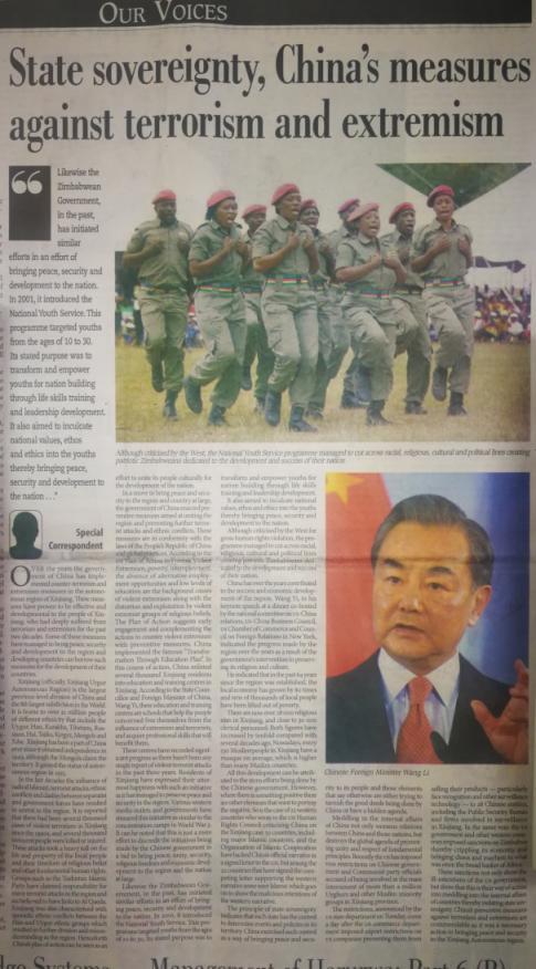 10月19日,津巴布韦第一大报《先驱报》发表题为《国家主权,中国的反恐和反极端主义措施》的评论文章,高度赞扬中国反恐和反极端主义措施,强烈谴责美国插手中国新疆事务、干涉别国内政和侵犯他国主权行为。