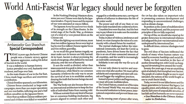 2020年9月3日,为纪念中国人民抗日战争暨世界反法西斯战争胜利75周年,中国驻津巴布韦大使郭少春在津《先驱报》发表题为《战争遗产永志不忘》的署名文章。全文译文如下: