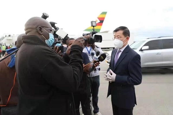 津巴布韦当地时间2月15日6时许,载运中国新冠疫苗的津航包机在晨曦中平稳降落于穆加贝国际机场,中国政府援津的20万剂疫苗运抵津首都哈拉雷。中国驻津大使郭少春和津巴布韦副总统兼卫生部长奇温加、财政部长恩库贝、代理外交部长穆维拉及津卫生部、外交部、财政部高级官员在机场迎接。