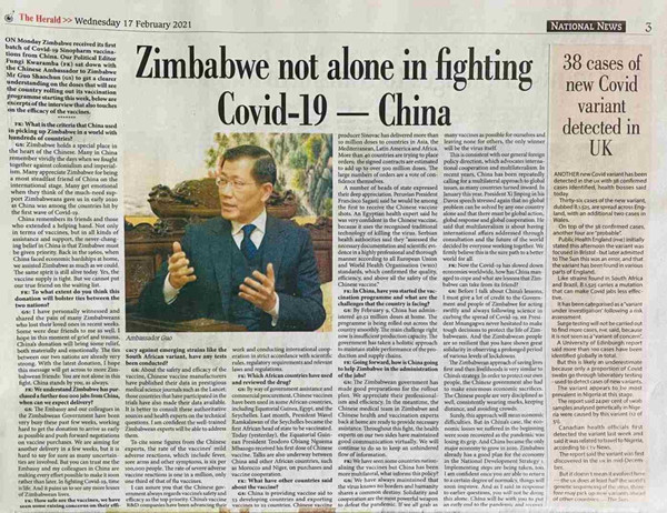 2021年2月16日,郭少春大使接受津巴布韦《先驱报》书面采访,介绍中国对津援助新冠肺炎疫苗重要意义并回应津民众关心的问题。