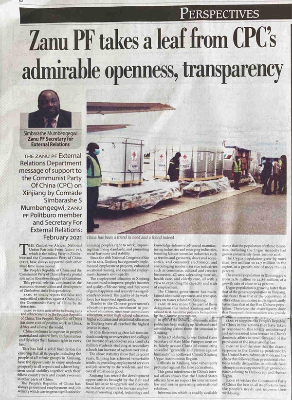2月23日,津巴布韦执政党津巴布韦非洲民族联盟—爱国阵线(简称“津民盟”)发表声明,强烈谴责美国前国务卿蓬佩奥等少数政客编造所谓中国在新疆搞“种族灭绝”的政治谎言。