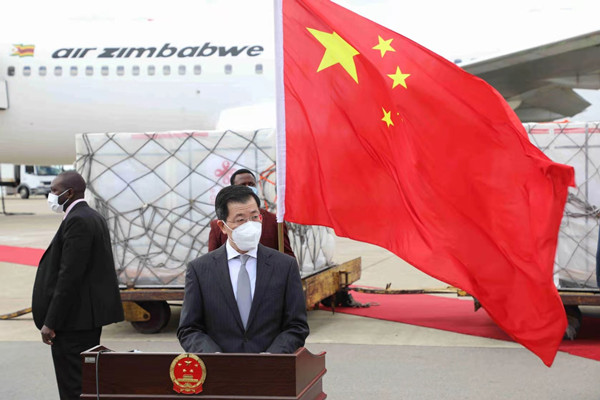 郭大使在致辞时表示,中国连续两批向津提供疫苗援助,这是两国和两国人民之间深厚友谊和团结互助的生动诠释。中津是好朋友、好兄弟、好伙伴,两国携手并肩共同争取民族解放,捍卫国家主权和平等,倡导国际公平正义和团结合作,为推动构建人类命运共同体做出积极贡献。中方将继续支持津巴布韦早日战胜疫情,实现经济社会复苏。