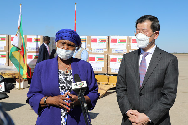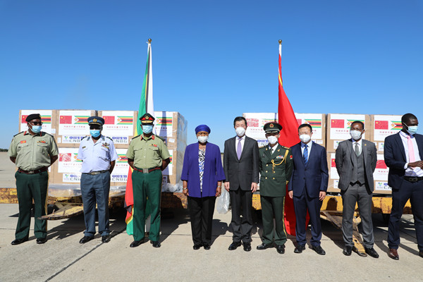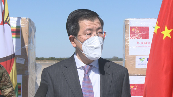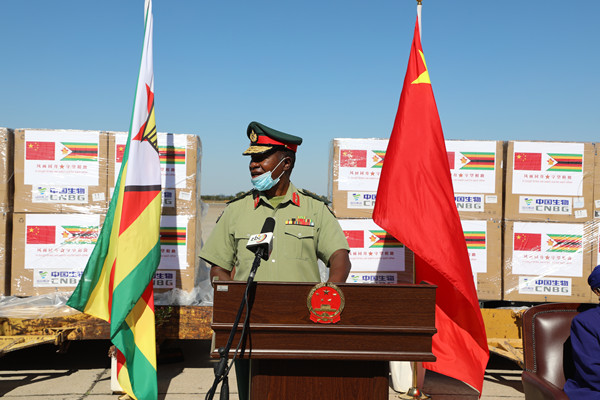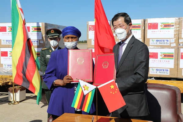 2021年5月17日,由中国人民解放军向津巴布韦国防军援助的国药新冠疫苗运抵津首都哈拉雷国际机场。中国驻津大使郭少春、津国防和退役军人事务部部长穆欣古里、国防军司令西班达上将等出席交接仪式。郭大使、穆欣古里部长现场签订交接证书并致辞。
