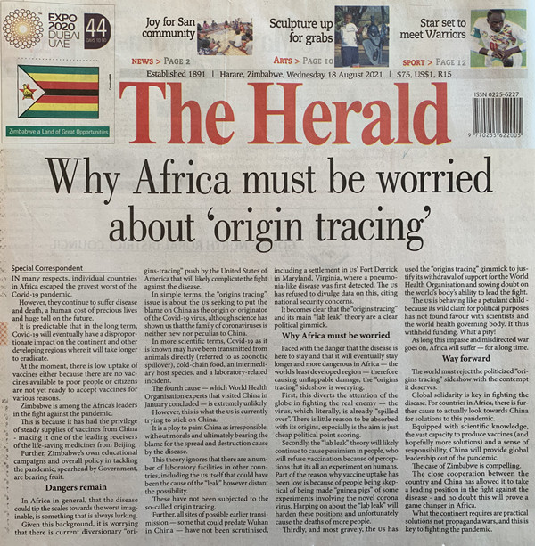 8月18日,津巴布韦第一大报《先驱报》发表题为《为什么非洲国家必须警惕“溯源问题”》的文章,高度赞扬中津抗疫合作成果,揭批美国将溯源问题政治化的险恶用心,呼吁非洲国家对此保持高度警惕。文章摘译如下: