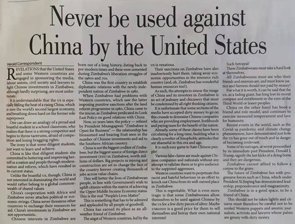 9月24日,津巴布韦第一大报《先驱报》发表评论文章《不作美国反华棋子》,抨击美国收买、培训写手,教唆抹黑中国在津投资企业,揭露其卑劣手段和丑恶嘴脸,警示津记者和民众勿被其蒙蔽和利用。