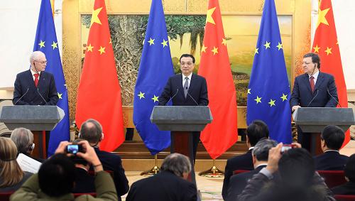 2013年11月21日下午,国务院总理李克强与欧洲理事会主席范龙佩、欧盟委员会主席巴罗佐共同会见记者。