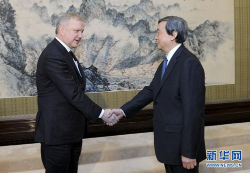 2014年1月15日,国务院副总理马凯在中南海紫光阁会见欧盟委员会副主席兼经济与货币事务委员雷恩。