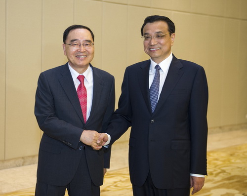 2014年4月10日下午,国务院总理李克强在海南博鳌会见来华出席博鳌亚洲论坛2014年年会的韩国总理郑烘原。