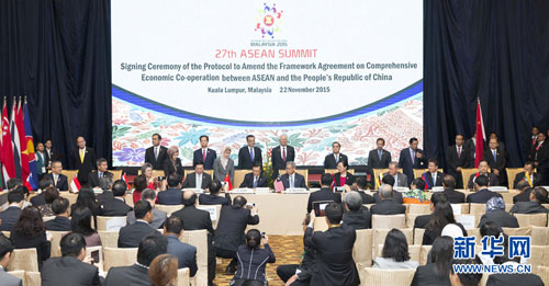 当地时间11月22日下午,国务院总理李克强当地时间在吉隆坡国际会议中心同东盟10国领导人共同见证标志着中国-东盟自贸区升级谈判全面结束的成果文件-《中华人民共和国与东南亚国家联盟关于修订〈中国-东盟全面经济合作框架协议〉及项下部分协议的议定书》签字仪式。商务部长高虎城和东盟10国经贸部长作为政府代表签署《议定书》。