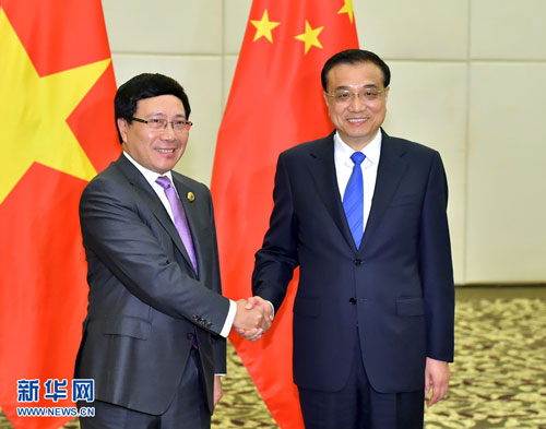 2016年3月23日下午,国务院总理李克强在三亚会见代表越南总理阮晋勇来华出席澜沧江-湄公河合作首次领导人会议及博鳌亚洲论坛2016年年会的越南副总理范平明。