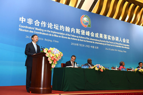 2016年7月29日,中非合作论坛约翰内斯堡峰会成果落实协调人会议在北京开幕。中国国家主席习近平向会议发来贺信。国务委员杨洁篪出席开幕式并宣读了习近平主席的贺信。