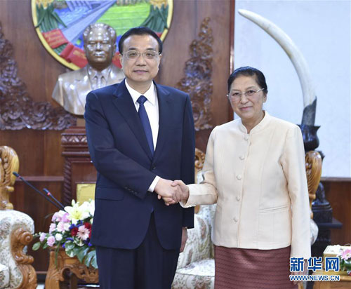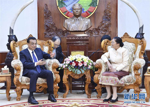 当地时间2016年9月8日下午,国务院总理李克强在万象国会大厦会见老挝国会主席巴妮。