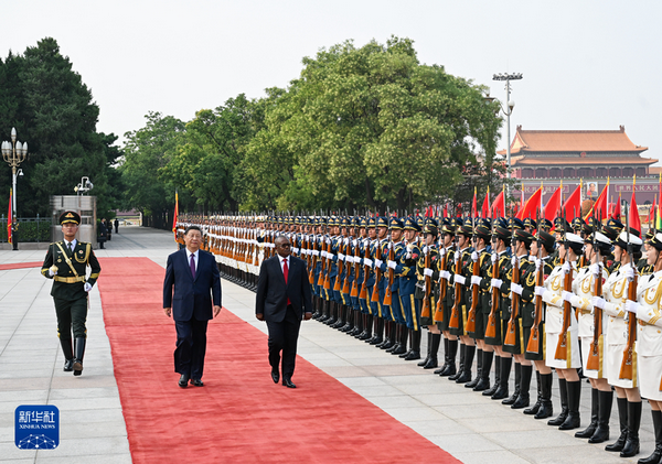 会谈前,习近平和夫人彭丽媛在人民大会堂东门外广场为恩巴洛和夫人迪尼西娅举行欢迎仪式。