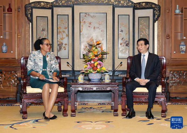 2025年10月14日,全国政协主席王沪宁在京会见来华出席全球妇女峰会的多米尼克总统伯顿。