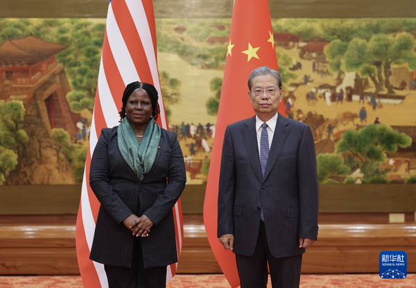 2025年10月15日,全国人大常委会委员长赵乐际在北京会见来华出席全球妇女峰会的利比里亚临时参议长劳伦斯。