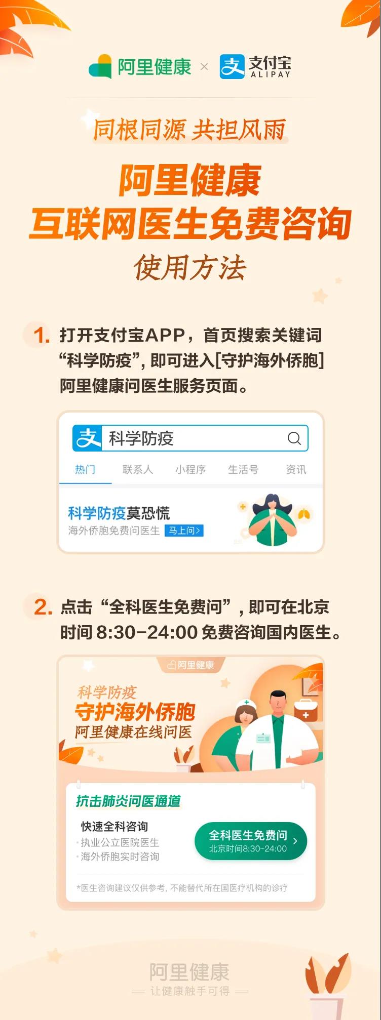 据介绍,阿里健康近日开通“海外侨胞在线医疗咨询专区”,并已协调组织有湖北问诊经验、经过新冠肺炎诊疗方案培训的公立医院执业医生进入这一项目。海外侨胞打开支付宝APP,首页搜索关键词“科学防疫”,点击进入“守护海外侨胞”阿里健康在线问医服务页面,即可在北京时间 8:30-24:00 免费咨询国内医生。此外,专区还提供了涉新冠肺炎防控的最新权威科普。