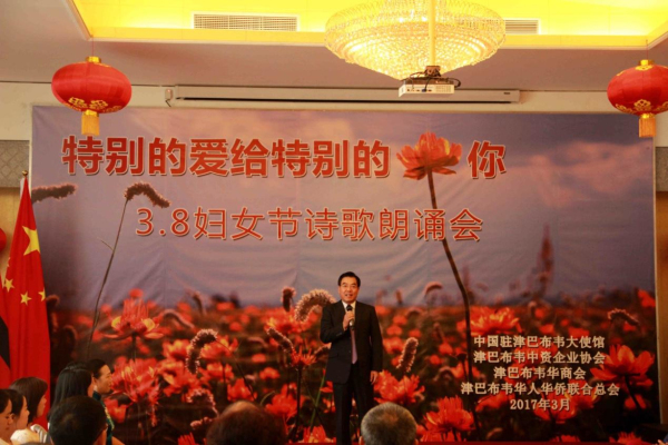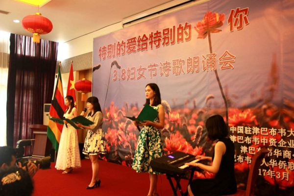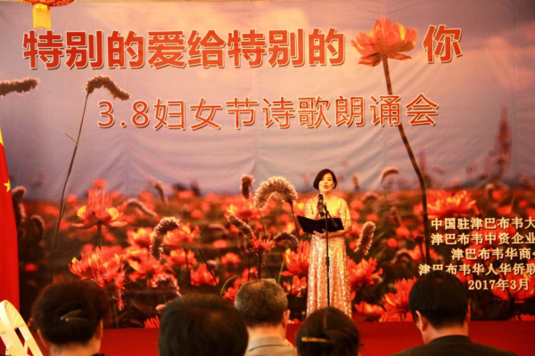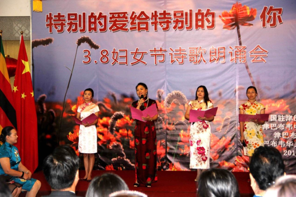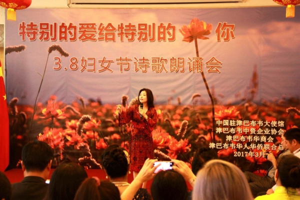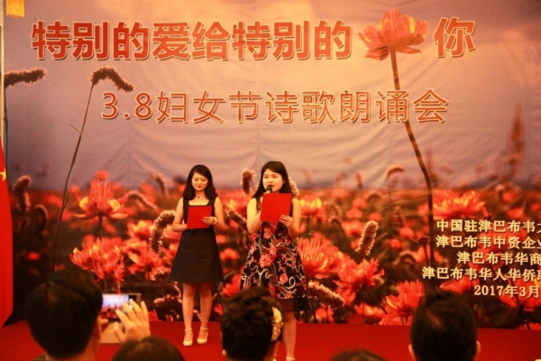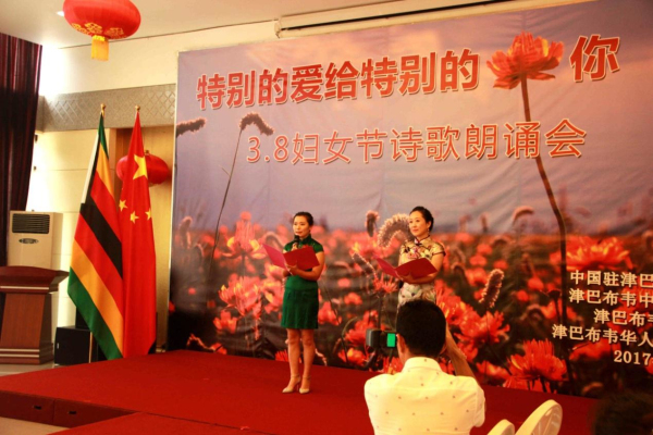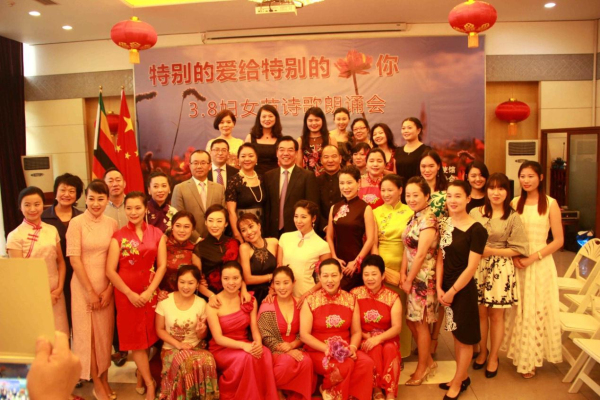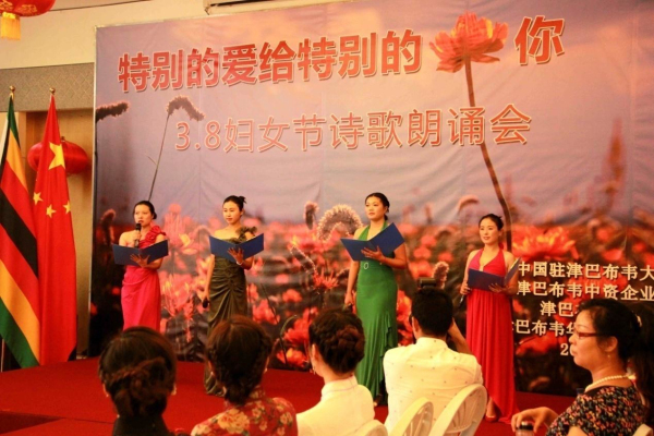 3月8日下午,从中国驻津巴布韦使馆活动大厅里不时传出阵阵的配乐诗朗诵,“特别的爱给特别的你——3.8妇女节诗歌朗诵会”正在如火如荼地进行中。使馆全体工作人员以及来自在津中资企业商会、华商会、华人华侨联合总会的负责人和妇女代表、以及援津各专家组、孔子学院等150余名嘉宾欢聚一堂,以中国传统的文化形式共同庆祝“三八国际劳动妇女节”。