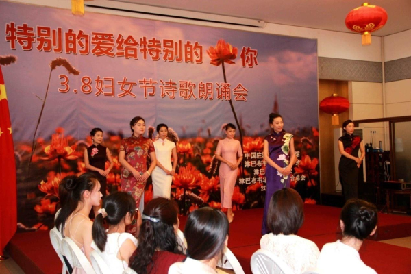 大使夫人张爱萍在致辞中感谢各侨团商会对此次活动的鼎力支持,感谢所有参与筹备此次活动的演职人员和工作人员以及在场捧场的华侨华人代表和媒体代表。张爱萍女士还特别提议全体女士向为了和谐社会和和谐家庭顶起“另一半天”的男同胞们表示感谢和致敬;勉励大家珍惜生活,懂得感恩;鼓舞女同胞们奋发向上,积极进取,赢得全场一阵阵掌声和欢呼声。整场活动以大使夫人张爱萍声情并茂的配乐诗朗诵«珍惜»和«天下女人»作为送给来宾的寄语圆满划上了句号。