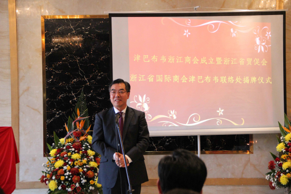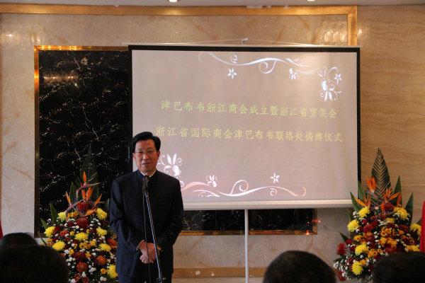 王辉忠副主任祝贺浙商会及浙江贸促会驻津联络处成立,希望其心怀家乡、服务浙商,同时要加强与使馆之间的联系,尊重当地法律与风俗习惯、合法经营,积极履行社会责任,造福当地人民,为促进中津两国交流与合作多做贡献。