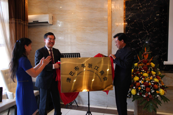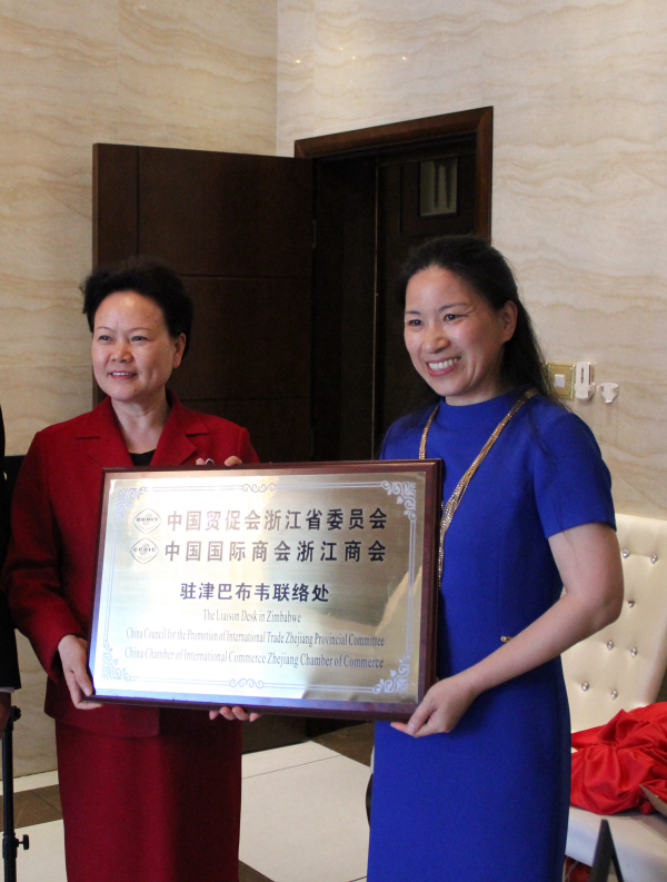 随后,王辉忠副主任与黄屏大使为浙商会揭牌,吴桂英会长向浙商会授予浙江省贸促会浙江省国际商会津巴布韦联络处牌匾,并授予王建红女士总代表职务。