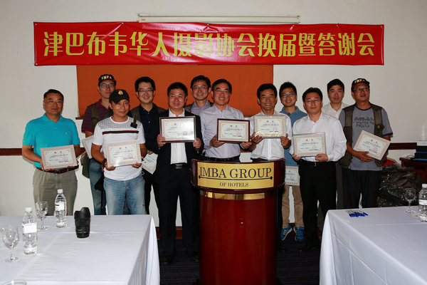中国驻津巴布韦大使黄屏应邀出席会议并发表讲话,他对摄影协会成功换届表示热烈祝贺,对协会成立一年多以来的工作和成绩表示充分肯定,希望协会全体会员再接再厉,拍出更多反映津巴布韦自然风光、人文社会和中津友谊的好照片,为增进两国人民相互了解、巩固两国友好基础作出积极贡献。黄大使还愉快地接受了摄影协会聘请其担任名誉会长的邀请,并为首届华侨华人迎新春庙会摄影展获奖者颁奖。